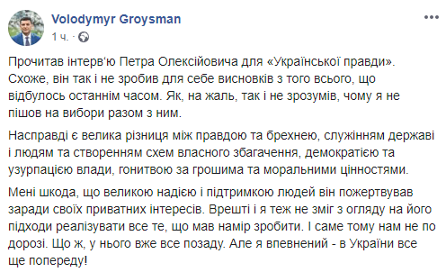 "На самом деле есть большая разница между правдой и ложью, служением государству и людям и созданием схем собственного обогащения, демократией и узурпацией власти, погоней за деньгами и моральными ценностями. Мне жаль, что большой надеждой и поддержкой людей он пожертвовал ради своих частных интересов", - написал Гройсман.