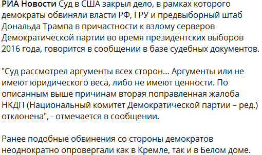 Суд в США закрыл дело, в рамках которого демократы обвиняли высшие власти России, ГРУ и предвыборный штаб Дональда Трампа в причастности к взлому серверов Демократической партии во время президентских выборов 2016 года.