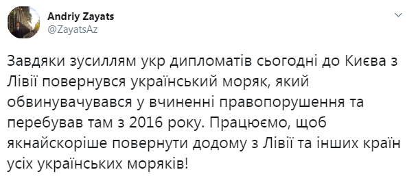 "Благодаря усилиям украинских дипломатов сегодня в Киев из Ливии вернулся украинский моряк, который обвинялся в совершении правонарушения и находился там с 2016 года. Работаем, чтобы как можно скорее вернуть домой из Ливии и других стран всех украинских моряков", - отметил дипломат.