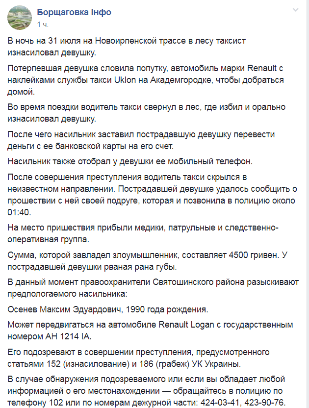 В полиции Киева установили личность водителя такси, который в ночь на 31 июля надругался над пассажиркой, избил и ограбил ее. Информацию о насильнике обнародовали в Facebook-группе Борщаговка Інфо.