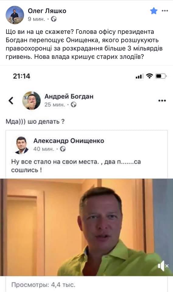 "Ляшко записал видео о том, что они с Кличко объединяются против "зеленой чумы". Этот видос запостил Александр Онищенко, собственно высказав гипотезу о будущих взаимоотношениях объединившихся. Это перепостил глава ОПУ Андрей Богдан с игривым комментарием. Ляшко репостнул, но самое смешное не то, что - репост = крышевание, а то, что все остальные высказывания его не смутили", - написала она.