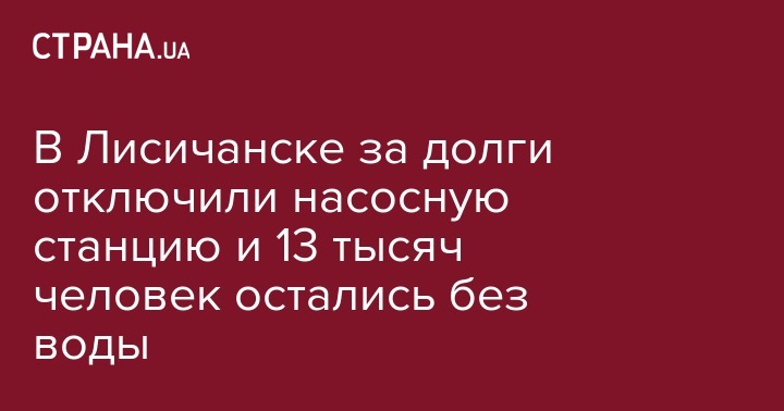 В Лисичанске Луганской области в среду. 31 июля, из-за задолженности отключили электроснабжение насосной станции "Лисичанскводоканал", без воды остались около 13 тыс. абонентов. Об этом сообщается на сайте Государственной службы по чрезвычайным ситуациям (ГосЧС).