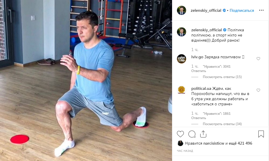 Фотограф запечатлел, как Владимир Зеленский качает ноги: он делает выпады. "Политика политикой, а спорт никто не отменял. Доброе утро", - сказано в подписи к фото.
