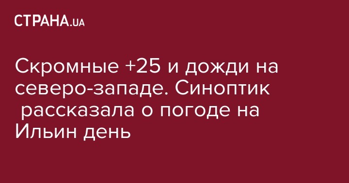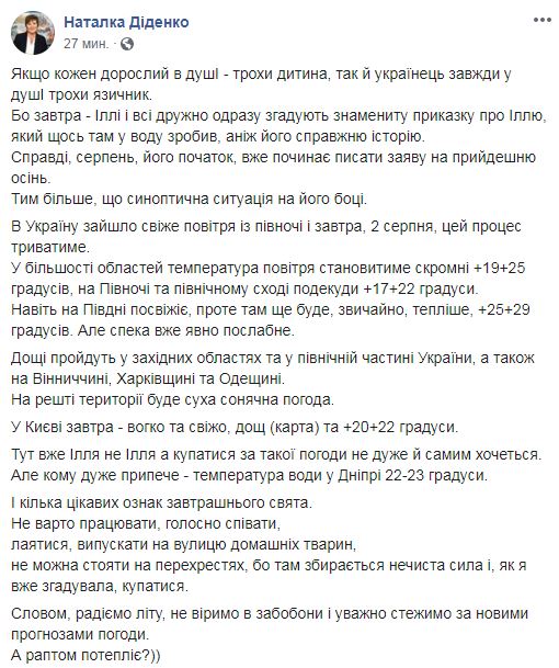 В пятницу, 2 августа, на Ильин день, в Украине станет прохладнее. В большинстве областей температура воздуха составит "скромные +19...+25 градусов", на севере и северо-востоке местами +17...+22 градуса. Об этом синоптик Наталья Диденко сообщила в Facebook.