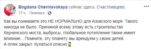 Она также опубликовала подтверждающие фото и видео с отдыха вблизи Геническа Херсонской области. "Как вы понимаете, это не нормально для Азовского моря. Такого никогда не было. Причиной всему этому есть строительство Керченского моста, выбросы, глобальное потепление также имеет влияние", – отметила она.