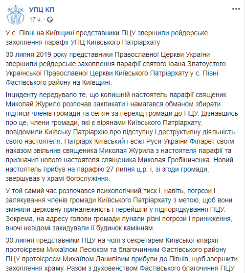 Отмечается, что глава УПЦ КП Филарет освободил священника Николая Журилу от выполнения обязанностей настоятеля этого храма и назначил нового - священника Николая Гребиниченко, который с 27 июля совершал в храме богослужения.