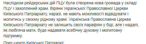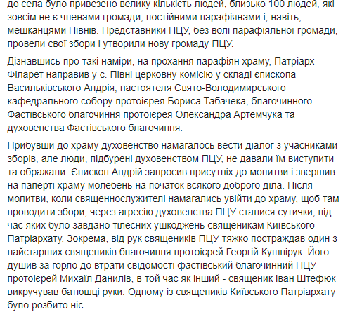 Также поясняется, что 30 июля представители ПЦУ прибыли в Петухов, чтобы совершить захват храма. Вместе с духовенством в село привезли около 100 человек, которые не являются членами общины, постоянными прихожанами и даже жителями Петухов. Представители ПЦУ, без участия приходской общины, провели свои собрания и образовали новую общину ПЦУ.