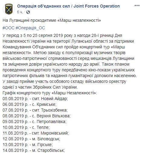 Также предусмотрены кинопоказы украинских патриотических фильмов и оказание гуманитарной помощи населению. В мероприятии примет участие личный состав военного оркестра одной из частей Вооруженных сил Украины. Также приводится график концертного тура.