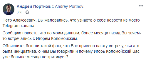 Сообщаю новость, что по моим данным, более месяца назад Вы зачем-то встречались с Игорем Коломойским. Объясните, был ли такой факт, что Вас привело на эту встречу, чья это была инициатива, о чем Вы говорили и почему Игорь Коломойский Вас уже больше месяца не критикует?" - написал в Facebook Портнов.