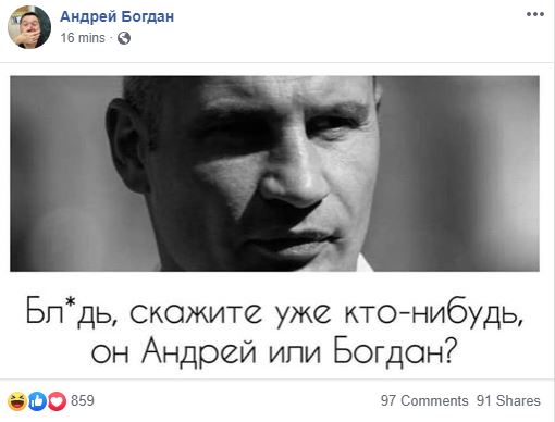 "Бл@@ь, скажите уже кто-нибудь, он Андрей или Богдан?", - написано под фото киевского градоначальника, чья необычная манера изъяснятся часто становится объектом насмешек.