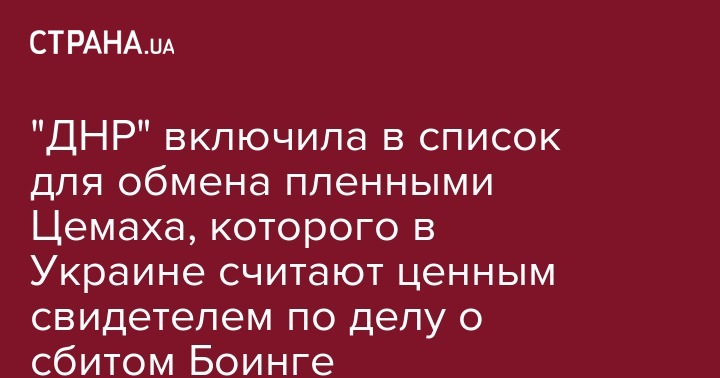В составленный "ДНР" список пленных для обмена с Киевом включили Владимира Цемаха, которого украинские спецслужбы задержали как "ценного свидетеля" по делу о сбитом малазийском "Боинге" (ранее "Страна" писала подробно об этом случае). Об этом сообщает РИА "Новости" со ссылкой на "омбудсмена ДНР" Дарью Морозову.