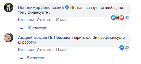 Однако позже в комментарии к посту нардепа заглянули и сам президент Украины Владимир Зеленский, а также глава Офиса президента Андерей Богдан. "Нет, господин Иванчук, вы пообещали, поэтому финансируйте", - написал Зеленский. "Нет. Президент верит, что вы профинансируете эти работы!", - поддержал лидера страны Андрей Богдан.