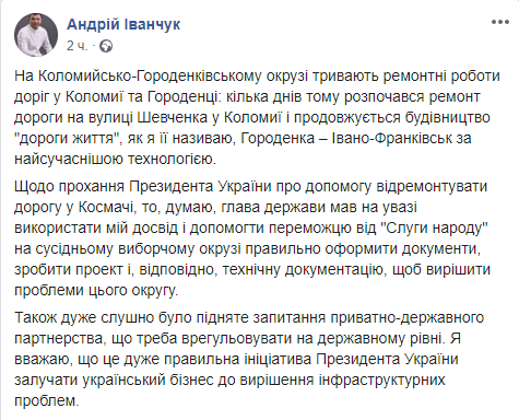 Кроме того, нардеп также прокомментировал просьбу Владимира Зеленского отремонтировать за свой счет дорогу в Космаче, стоимость ремонта которой составляет 175 млн грн.