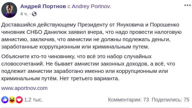 "Объясните кто-то чиновнику, что все это набор случайных словосочетаний. Не бывает амнистии законных доходов, а все, что подлежит амнистии заработано именно или коррупционным или криминальным путем. Нет третьего варианта".