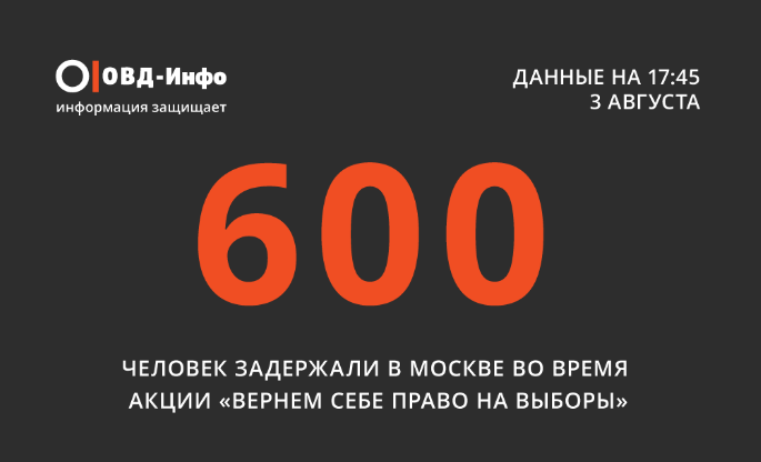 Данные полиции совпадают с теми, которые называют правозащитники. Так, Twitter спецпроекта "ОВД-Инфо" на 17:45 по Москве тоже привел цифру 600 человек.