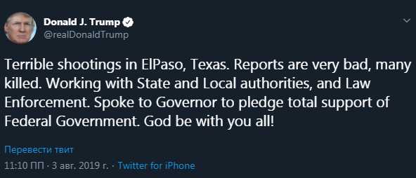 Об инциденте в своем Twitter написал президент США Дональд Трамп. "Страшные перестрелки в Эль-Пасо, штат Техас. Отчеты очень плохие, многие убиты. Работаем с государственными и местными органами власти и правоохранительными органами. Говорил с губернатором о полной поддержке федерального правительства. Бог со всеми вами", - написал президент.