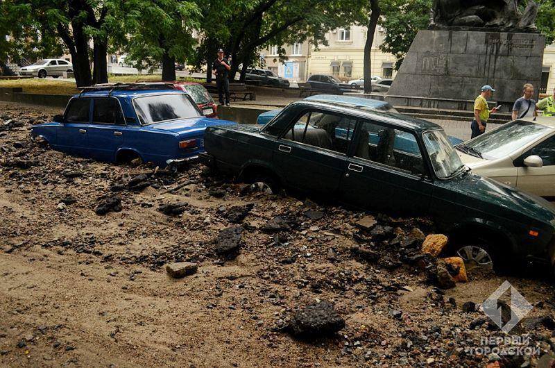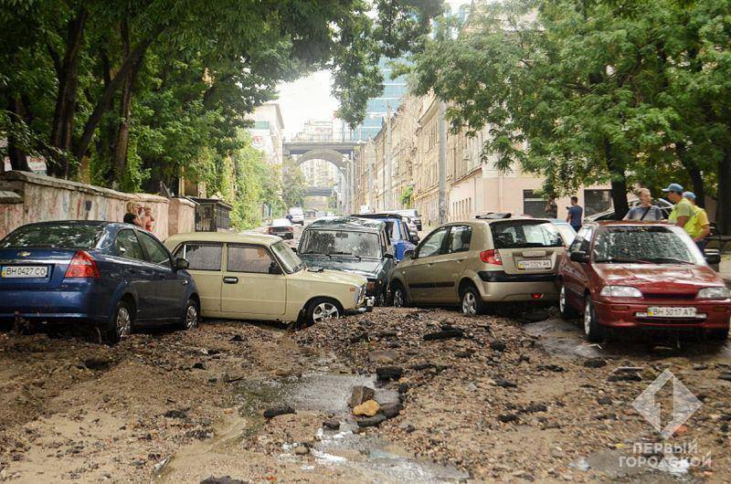 На Карантинном спуске в центре Одессы поток воды снес  припаркованные автомобили, сорвал асфальтовое покрытие и разворотил ливневый коллектор.