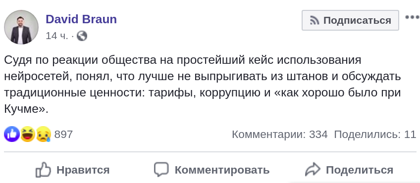 "Судя по реакции общества на простейший кейс использования нейросетей, понял, что лучше не выпрыгивать из штанов и обсуждать традиционные ценности: тарифы, коррупцию и "как хорошо было при Кучме", - написал Давид.