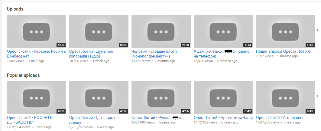 Отметим, что в кэш-памяти Google сохранена копия страницы канала, среди последних и популярных видео многие содержат в названии нецензурную лексику. В основном клипы посвящены негативному отношению автора к россиянам и их агрессии на Донбассе. У Мухарского было почти 74 тысяч подписчиков.