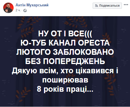 "Ну вот и все. YouTube-канал Ореста Лютого заблокирован без предупреждений. Спасибо всем, кто интересовался и распространял. 8 лет работы...", - написал Мухарский.