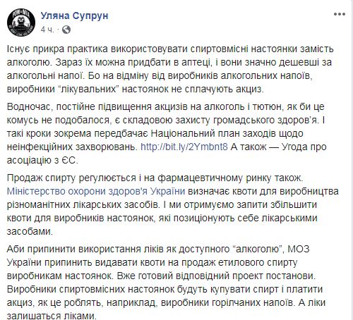 "Производители спиртосодержащих настоек будут покупать спирт и платить акциз, как это делают, например, производители алкогольных напитков", - анонсировала Супрун. Проект этого постановления уже готов и вскоре его могут принять.