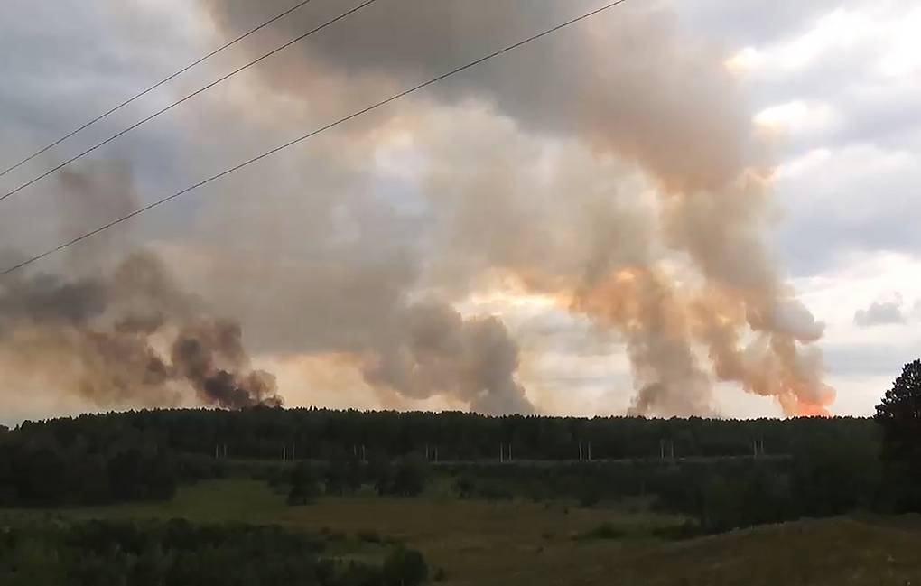 В Ачинском районе Красноярского края России продолжает пылать и взрываться арсенал, где хранились пороховые заряды к артиллерийским боеприпасам.