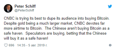 При этом упомянутый выше Питер Шифф заявлял, что биткоин никогда не вернется к своему историческому максимуму в $20 тыс и назвал криптовалюту финансовым пузырем.
