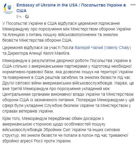 Меморандум является результатом двухлетней работы сотрудников посольства Украины в США совместно с американцами в подготовке необходимой нормативно-правовой базы, которая позволяет поиск на территории Украины и возвращения в США останков погибших и пропавших без вести во время Второй мировой войны американских военнослужащих.