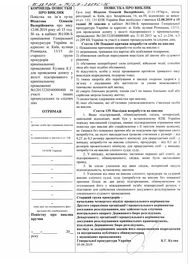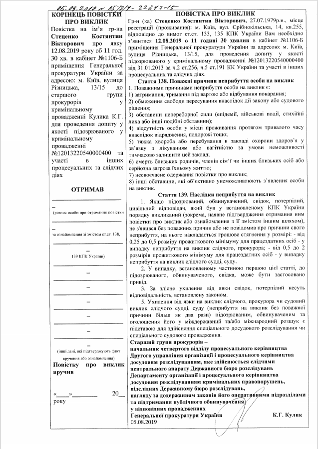 Напомним, на сайте Генпрокуратуры Украины в апреле размещены повестки, в частности, бывшему на то время замглаве администрации президента Филатову, экс-главе НБУ Гонтаревой и управляющему партнеру и совладельцу инвестгруппы ICU Стеценко. Их вызывали к следователю по особо важным делам для вручения уведомления о подозрении и проведения допроса в качестве подозреваемых в рамках уголовного производства относительно бизнесмена Сергея Курченко. Речь идет об уголовном производстве №12013220540000400 от 31 января 2013 года.