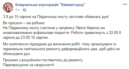 Сообщается, что ограничения связаны с работами по обновлению асфальтового покрытия на части Южного моста в направлении Левого берега. Движение будет ограничено с 22:00 8 августа до 23:00 15 августа.