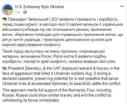 "Президент Зеленский и ВСУ проявили сдержанность и храбрость перед лицом агрессии, в результате которой 6 августа погибли 4 украинских военнослужащих во время объявленного режима прекращения огня, сохраняя потенциал для настоящего прекращения огня, которое спасает жизни украинцев, и этим ускорили дипломатические усилия для мирного урегулирования конфликта", - говорится в комментарии посольства .