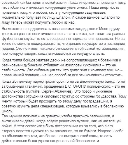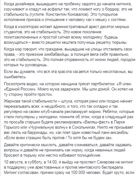 "10 августа, в субботу, в 14:00, я выйду на проспект Сахарова на митинг в поддержку уже арестованных и против ментовского беспредела. Митинг согласован, причем сразу на 100 000 человек. Будет круто, если столько народу туда и придет" - написал Юрий.  "Чем больше нас, тем больше шансов, что когда-нибудь граждан России перестанут бить шпалой по лицу", - резюмировал он.