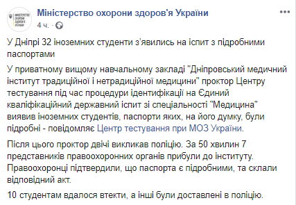 На экзамен в частном высшем учебном заведении "Днепровский медицинский институт традиционной и нетрадиционной медицины" 32 иностранных студента пришли с поддельными удостоверениями личности. После прибытия полиции десятерым студентам удалось убежать.