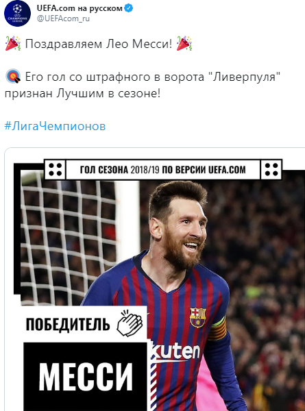 "Поздравляем Лео Месси! Его гол со штрафного в ворота "Ливерпуля" признан Лучшим в сезоне Лиги Чемпионов", - говорится в сообщении UEFA в соцсети.