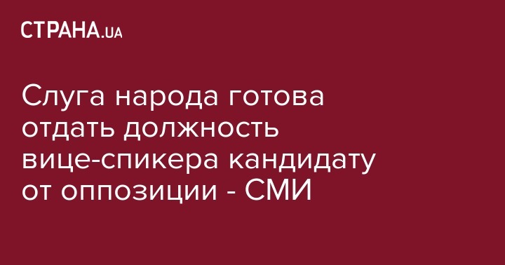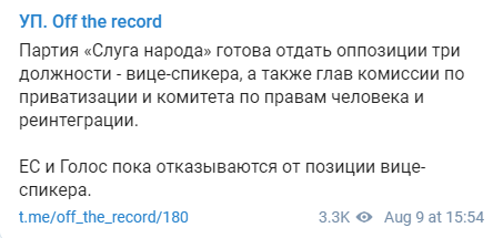 Президентская партия Слуга народа может отдать должность вице-спикера парламента одному из представителей оппозиции. Об этом сообщает телеграм-канал УП. Off the record.