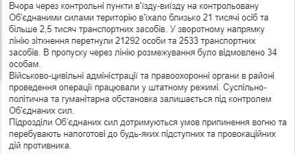 Сообщается, что силы противника обстреливали позиции украинских солдат из крупнокалиберных пулеметов и стрелкового оружия. В районе ответственности оперативно-тактической группировки "Восток" противник произвел 1 обстрел позиций Объединенных сил вблизи Лебединского со стороны Ужевки – из стрелкового оружия.