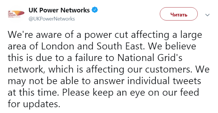 "Мы осведомлены об отключении электроэнергии, затронувшем значительную часть Лондона и юго-востока. Мы полагаем, что это произошло из-за сбоя в работе Национальной энергетической сети", - говорится в Twitter компании.