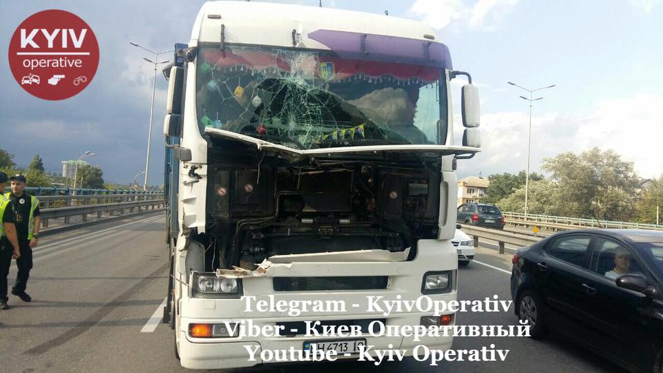 В Киеве три фуры угодили в ДТП на спуске, образовав огромную пробку до моста. Фото