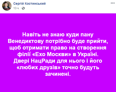 Член Национального совета Украины по вопросам телевидения и радиовещания Сергей Костинский отрицает, что в нашей стране дадут разрешение на работу российской радиостанции "Эхо Москвы". Об этом он написал в Facebook.