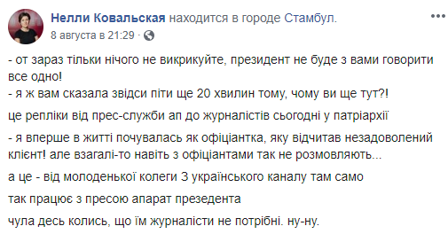 "Я впервые в жизни чувствовала как официантка, которую отчитал недовольный клиент! Но вообще-то даже с официантами так не говорят. Так работает с прессой аппарат Президента. Слышала где-то когда-то, что им журналисты не нужны. Ну-ну", -  написала Ковальская.