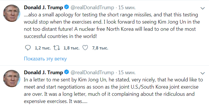"В нем было также небольшое извинение за испытания ракет малой дальности, и заверения, что эти испытания прекратятся после окончания учений. Я с нетерпением жду встречи с Ким Чен Ыном в недалеком будущем! Безъядерная Северная Корея станет одной из самых успешных стран в мире!" - завершил Трамп твит на оптимистической ноте