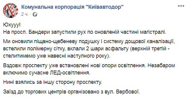 10 августа на проспекте Бандеры в Киеве запустили движение по обновленной части магистрали. Об этом на своей странице в Facebook сообщает коммунальная корпорация "Киевавтодор".