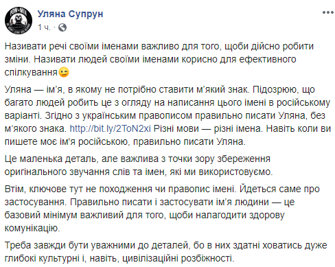 И.о. министра здравоохранения Украины Ульяна Супрун сообщила, что ее имя нужно правильно писать, как Уляна. При этом данный вариант написания имени распространяется как на украинский, так и на русский язык, написала она в Facebook.