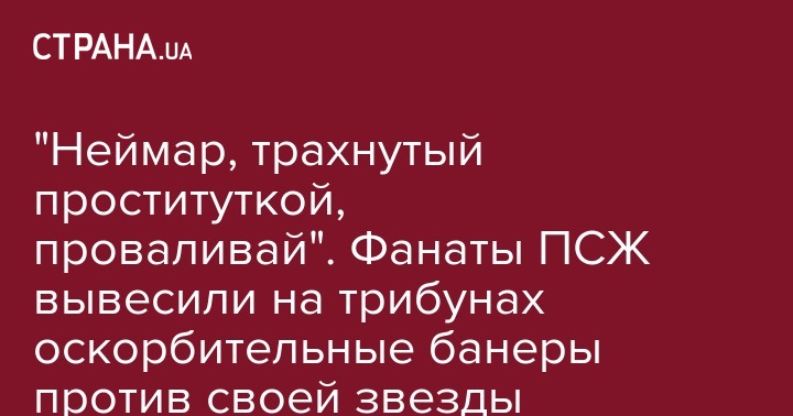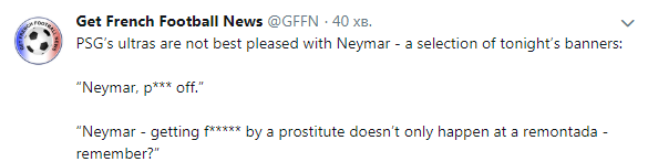 Фаны ПСЖ, которым изрядно надоели капризы звездного бразильца, развернули на трибунах плакаты с надписями: "Неймар, проваливай", и "Неймар, трахнутый проституткой, это бывает не только при ремонтаде, помнишь?".