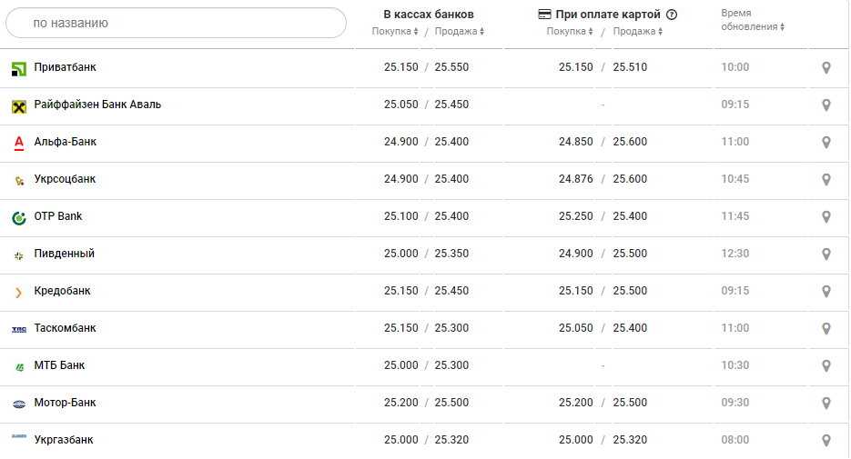 В банках курс доллара с утра был такой: покупка от 25 до 25,150 грн, продажа от 25,3 до 25,55 грн. К обеду покупка в некоторых банках упала до 24,9 грн.