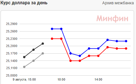 12 августа НБУ опустил курс доллара сразу на 22 копейки - до 25,09. В обменках доллар к вечеру подешевел на 8-10 копеек по сравнению с утром: 25,28 грн покупка и 25,35 грн - продажа. Межбанк закрылся с котировками: 25,19/25,22 грн. В банках покупка-продажа была 24,9-25,15/25,3-25,55 грн.