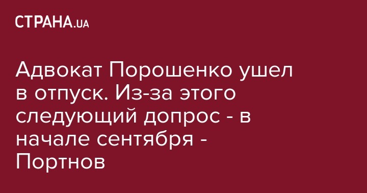 Адвокат Петра Порошенко заявил, что его клинт не сможет явиться на следующий допрос в конце нынешней недели, поскольку защитник уходит в двухнедельный отпуск. Об этом в своем телеграм-канале написал известный юрист Андрей Портнов.