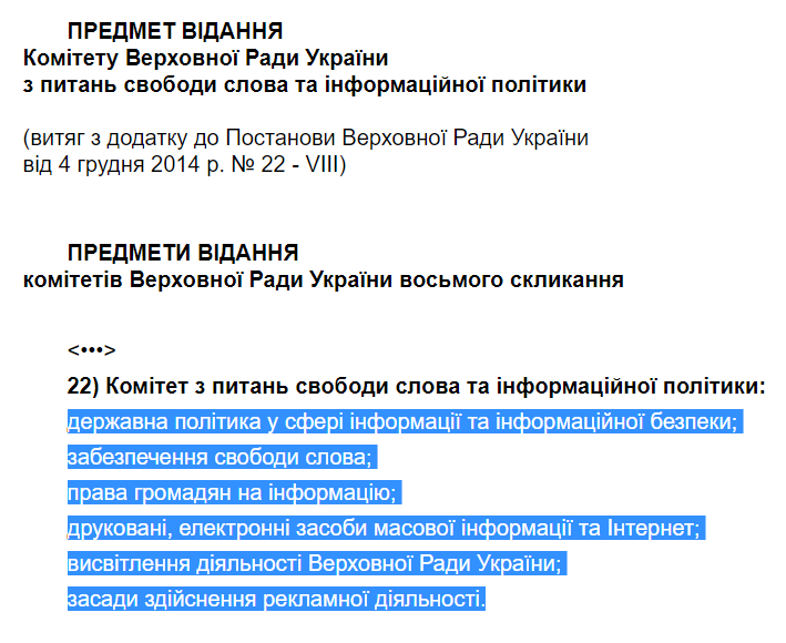 Комитет про вопросам гуманитарной и информационной политики должен возглавить Александр Ткаченко, поэтому под него перетягиваются все самые главные функции комитета: влияние на министерства, Нацраду по телевидению и радиовещанию, выдачи лицензий телеканалам, а также их прекращение, порядок освещения информации и контроль этой информации. Все эти полномочия забирают от комитета по вопросам свободы слова и оставят только незначительные функции такие как: защита свободы слова и защита самих журналистов, причем как - не ясно.