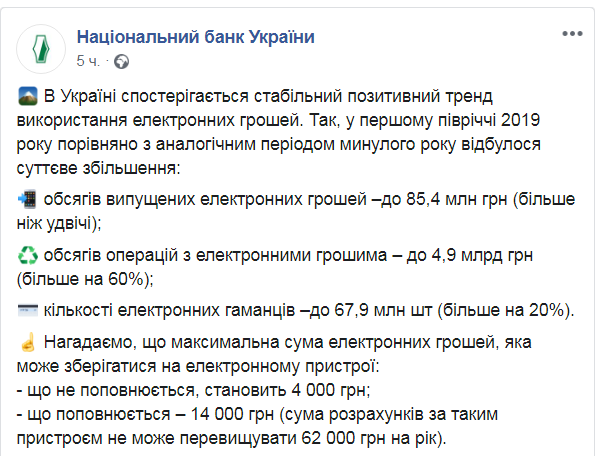 Если за весь 2018 год было выпущено 83,2 млн грн. электронных денег, то в этом году всего за шесть месяцев объем выпуска достиг 85,4 млн грн.