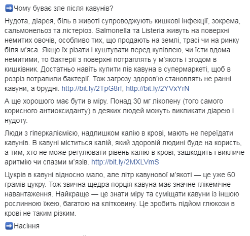 "Тошнота, диарея, боль в животе сопровождают кишечные инфекции, в частности, сальмонеллез и листериоз. Salmonella и Listeria живут на поверхности немытых овощей, особенно тех, что продают на земле, трассе или на рынке у мяса. Если их резать и пробовать перед покупкой, или есть дома немытыми, то бактерии с поверхности попадут в мякоть и впоследствии в кишечник. Достаточно даже купить пол арбуза в супермаркете, чтобы в разрез попали бактерии. Поэтому угрозу здоровью составляют не ранние арбузы, а грязные", - уверяет Супрун.